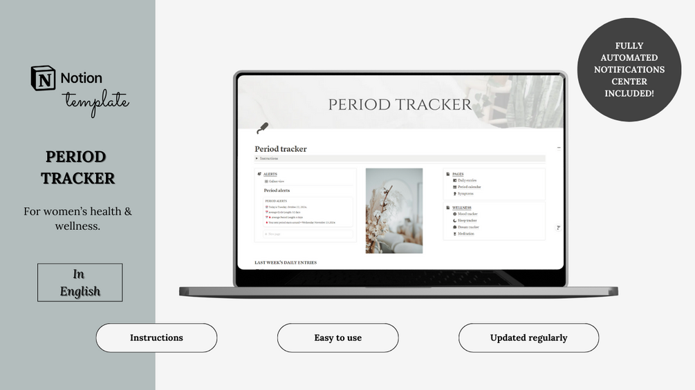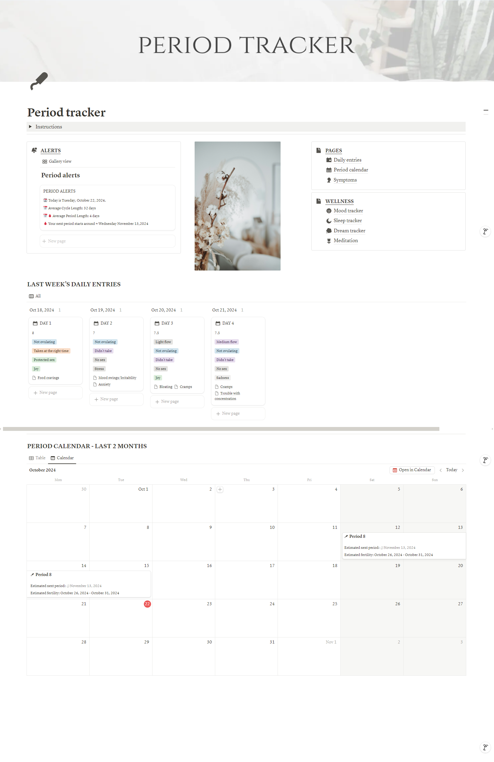 You'll get: The Notion period tracker template with included pages and databases with Canva templates for page covers.